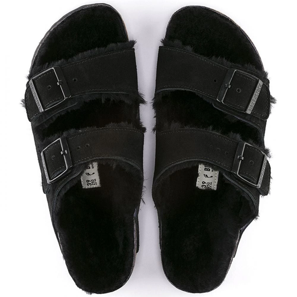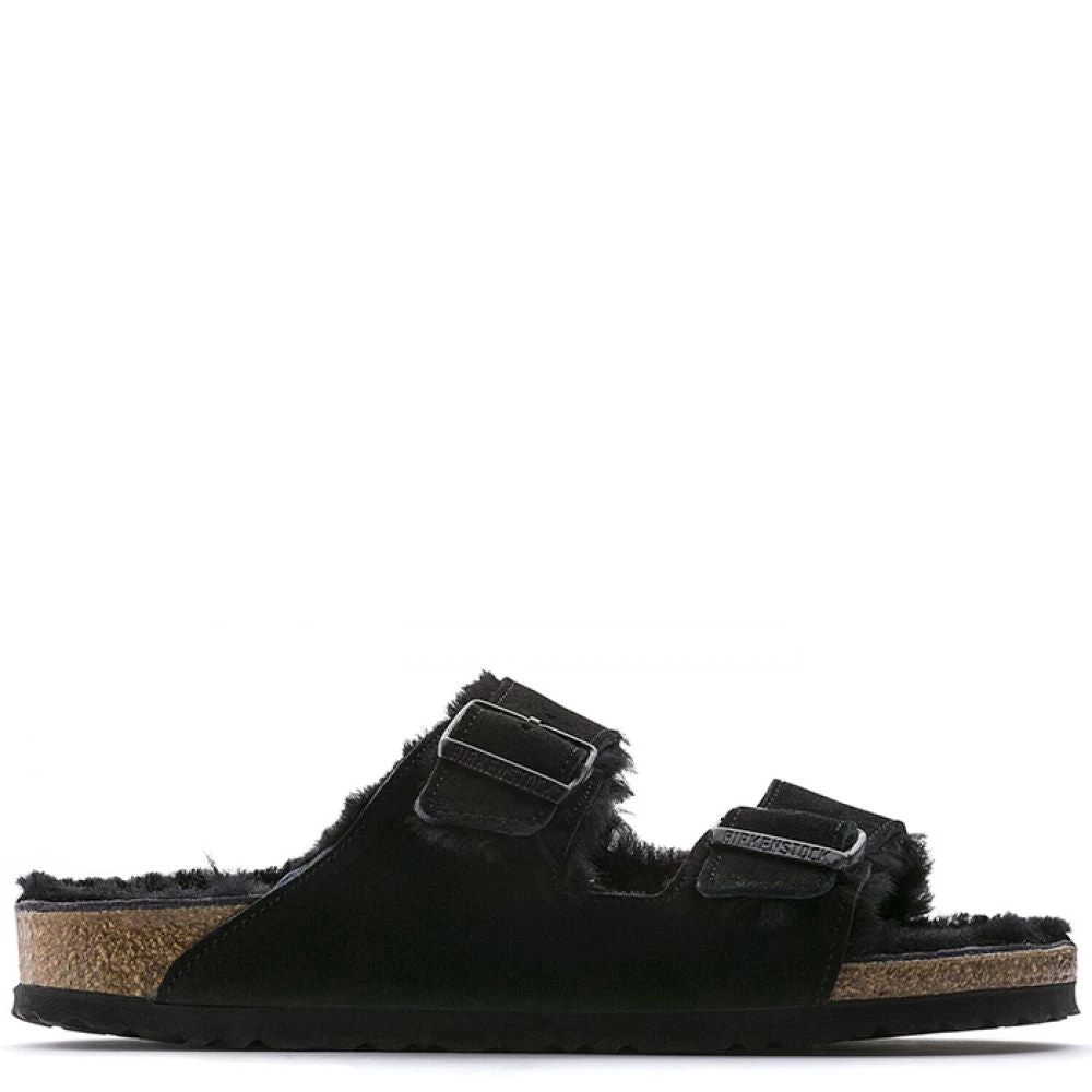 The Arizona Shearling in Black is a classic model with two adjustable straps. Featured in genuine high-quality suede – and is now available in an extra cozy version thanks to a soft, bright genuine shearling lining on the anatomically formed cork-latex footbed and straps. These sandals are perfect for chilly, winter evenings.