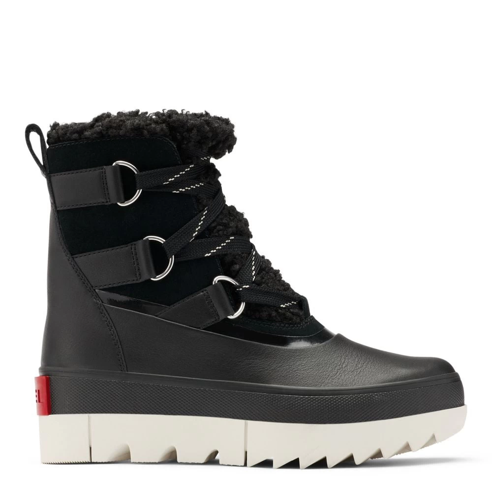 UPPER: A cozy winter boot to keep her warm during city walks. Waterproof full grain leather and suede combination. Shearling cuff and tongue. Leather heel pull tab. Metal hardware in eyestay . Leather shell with rubber mudguard. Shearling and textile lining. Seam-sealed waterproof construction. Laces are.